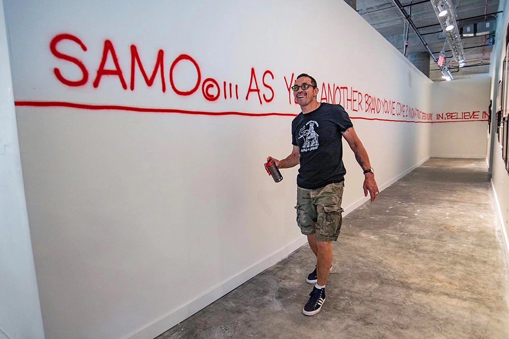 After years working in carpentry and construction, Diaz returned to his creative roots in 2016. He developed the “WET PAINT” series, cutting letters from New York City subway signs to form surreal, thought-provoking anagrams and installations. He also revived the SAMO© tag, merging his early graffiti roots with contemporary urban commentary.
