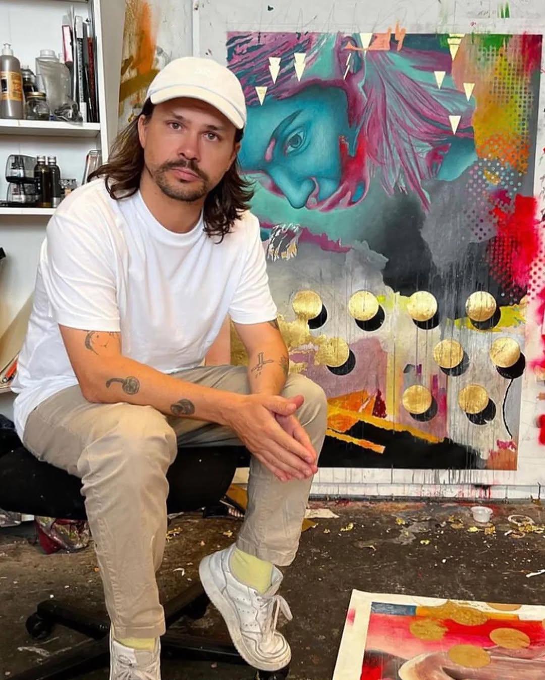 Ben Slow is an artist who emerged through the UK street art scene of the late 2000s. Having created large scale murals across the UK and internationally, Ben’s background in street art visibly informs his fine art studio practice. Born from the early days of throwing paint-filled balloons at walls, he combines an abstract aesthetic with refined portraiture, navigating the space between order and chaos. Stating that there is nothing scarier than a blank canvas, Ben uses an array of different materials and techniques to create his unique style; deconstructing, destructing and blurring boundaries to strike a balance between figurative and abstract.