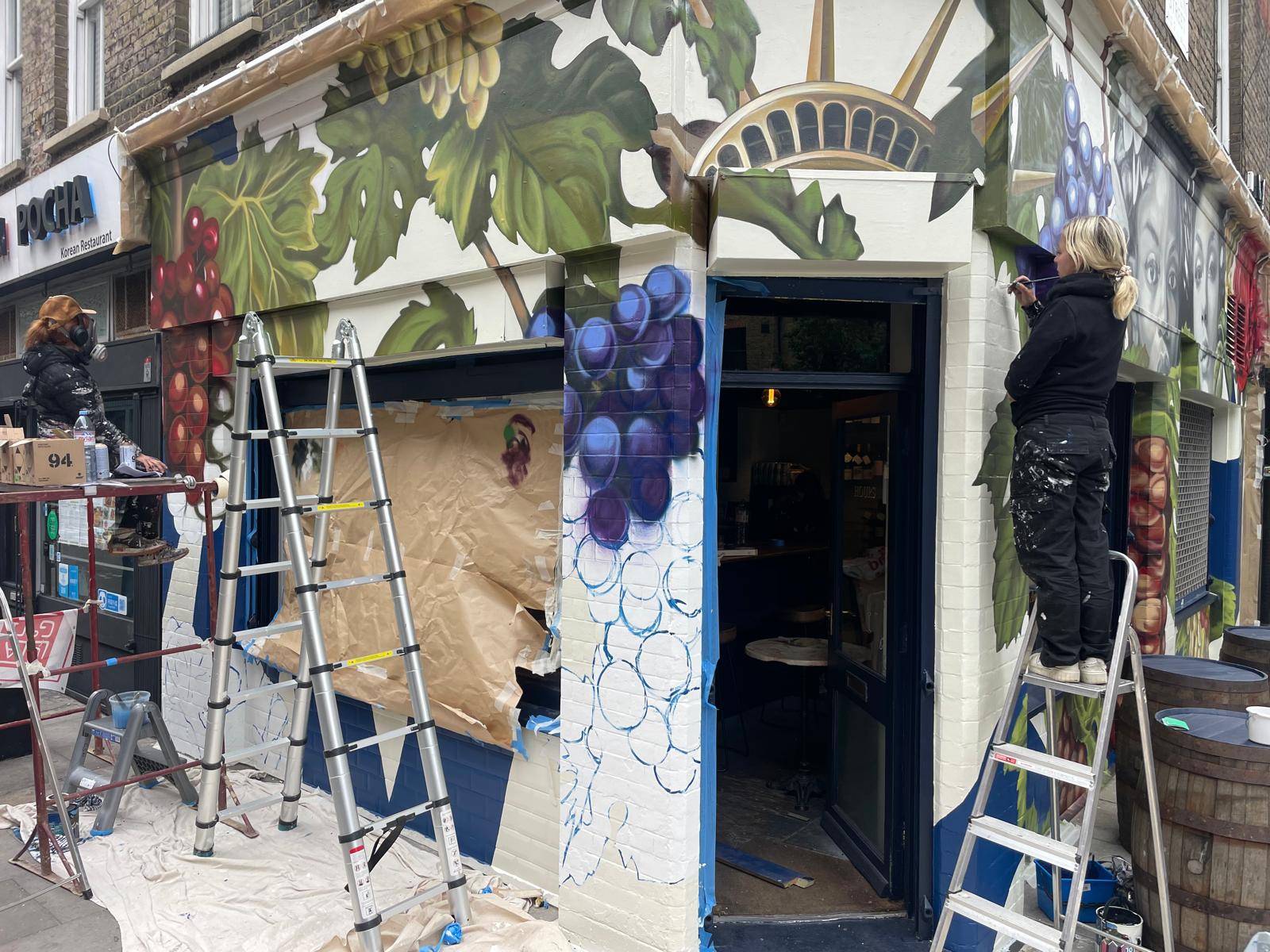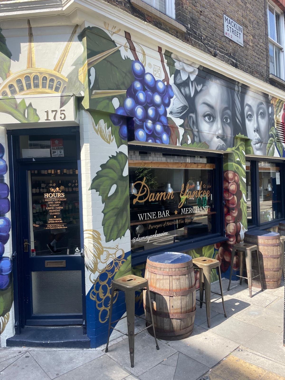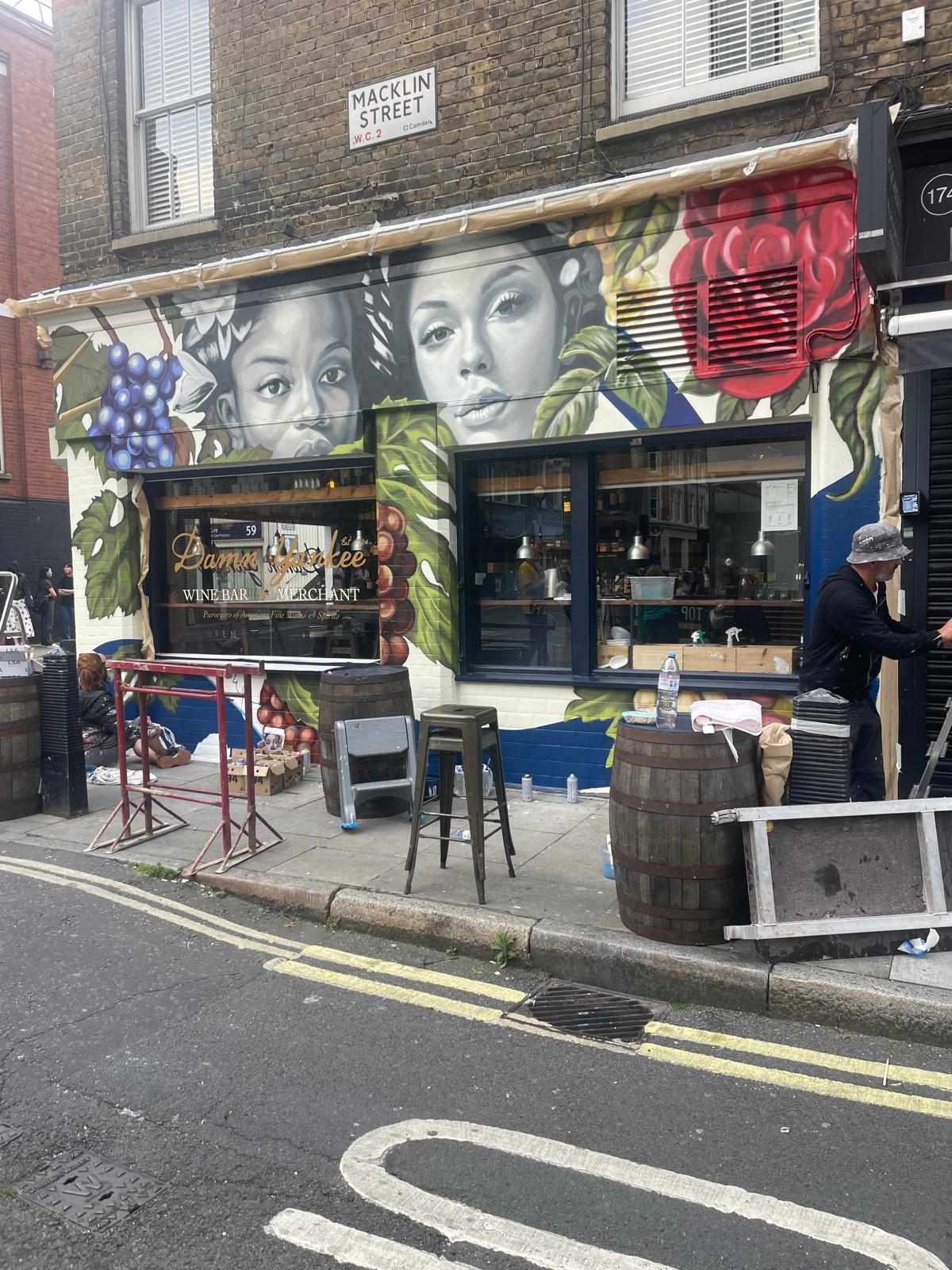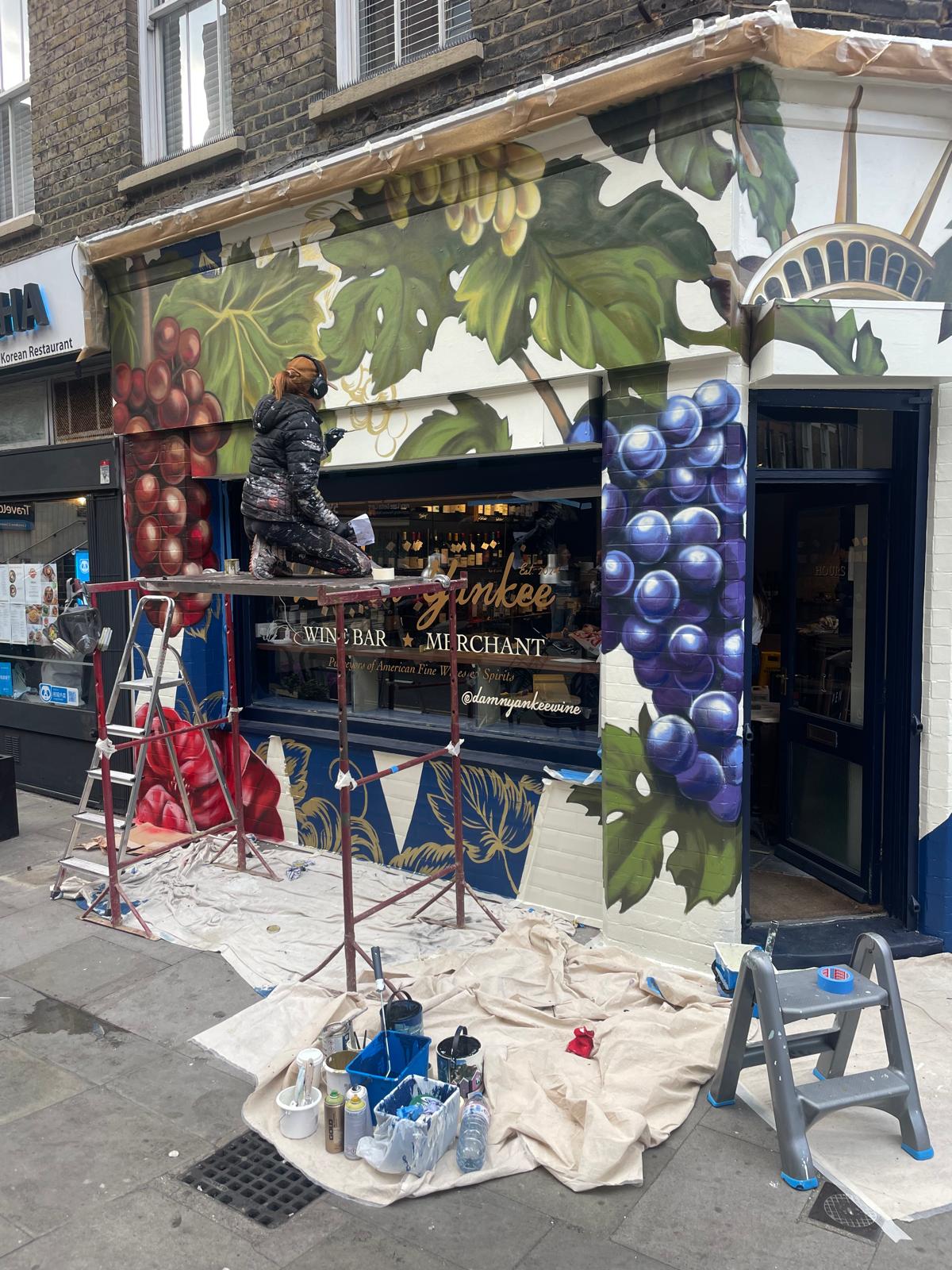 Lula Goce's first UK appearance painting a mural. Executed in May 2024, at Covent Garden Damn Yankee Wine Bar & Merchant, 175 Drury Ln, London, and is still on show to this day.