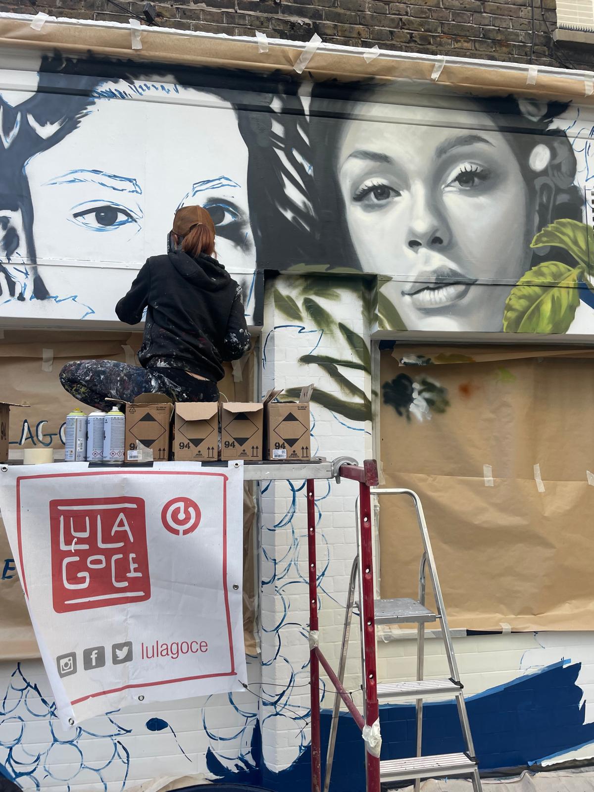 Lula Goce is one of Spains most pre eminent contempary urban street artists. This bold mural adorns the exterior of Damn Yankee, bringing a vibrant burst of colour and energy to Drury Lane. Marking her London debut in street art, the Galician artist transforms the façade with her signature blend of lush botanical motifs, expressive female figures and subtle touches of empowerment and nature.