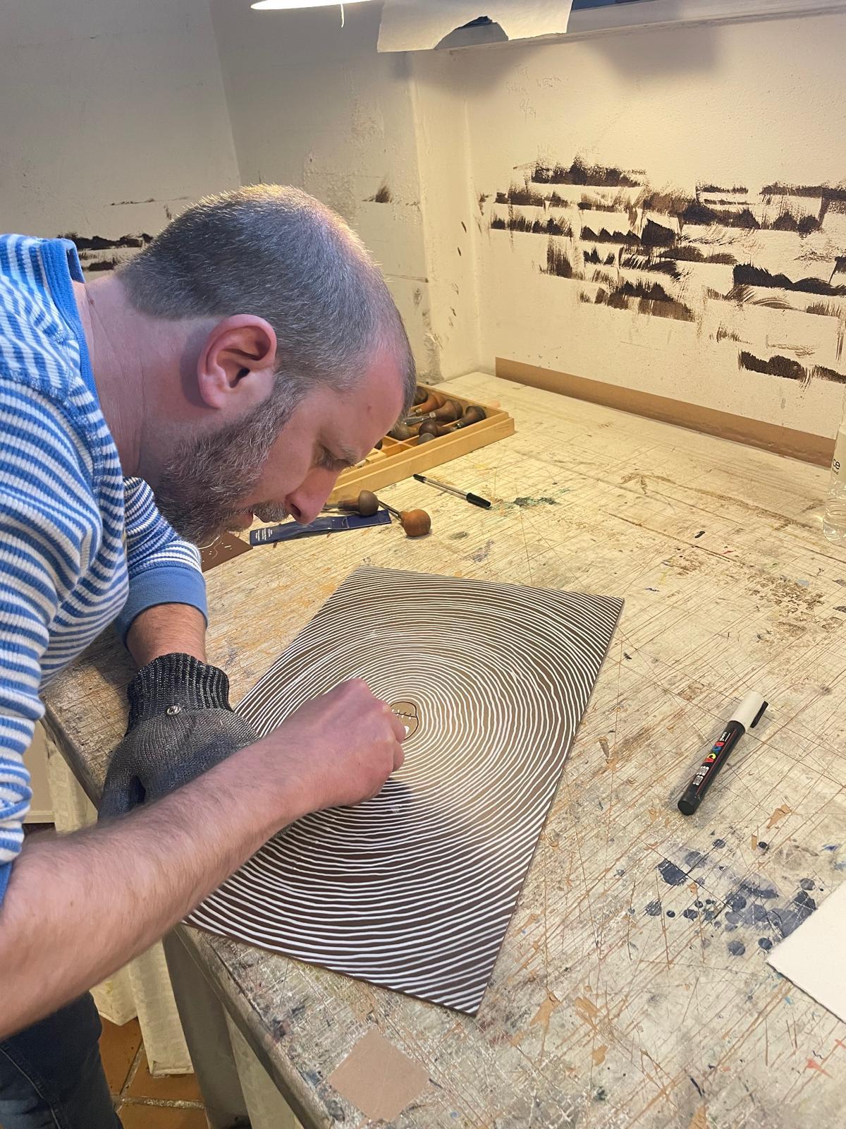Hayden Kays creates a lino cut print at Schäfer Grafik in Copenhagen, May 2023.
